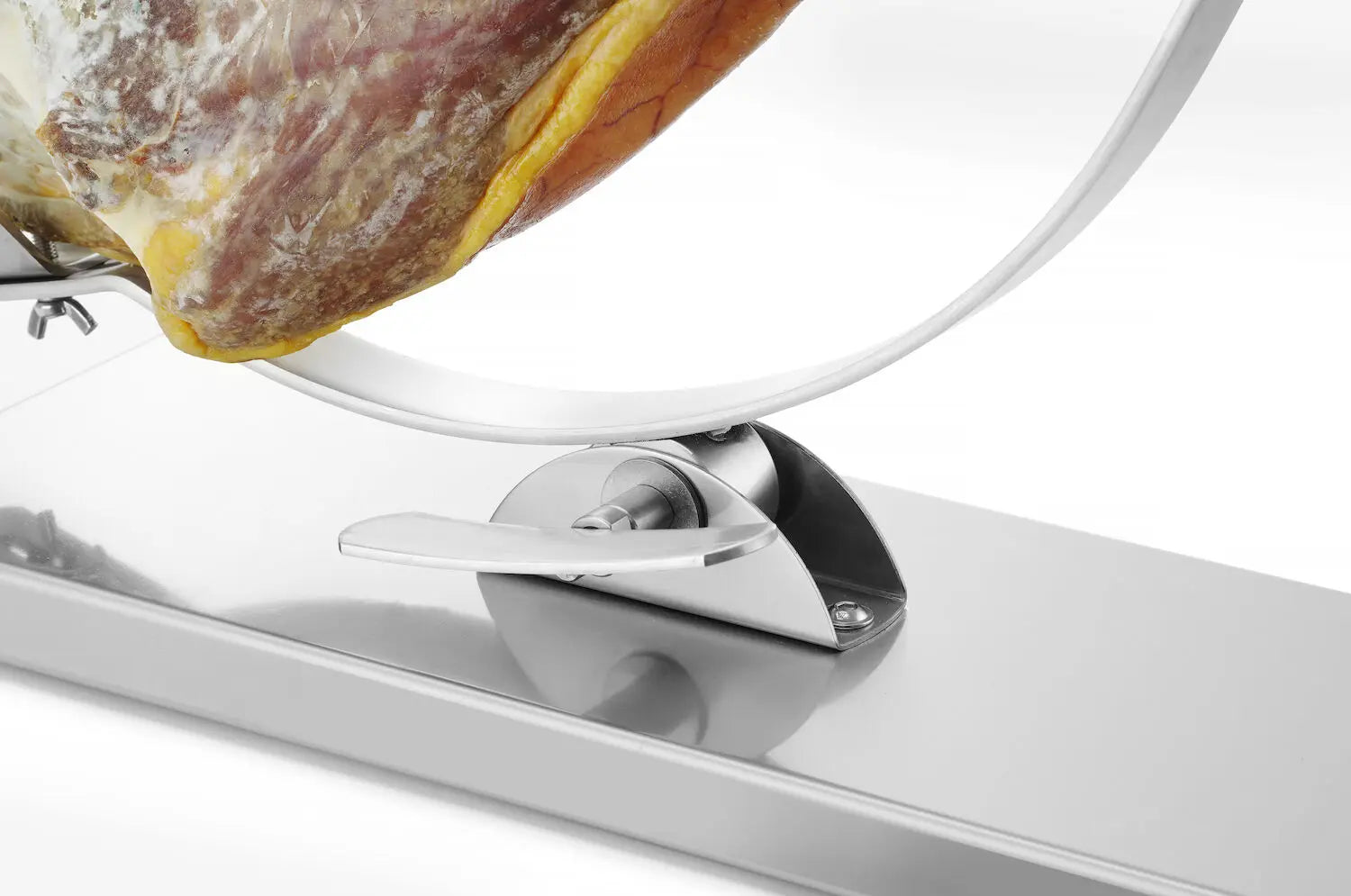 Il prosciutto viene fissato saldamente tramite una vite all'interno di un anello da 80 mm, che consente una rotazione fluida per accedere facilmente a ogni parte del pezzo. Il supporto è dotato di un sistema inclinabile, per una posizione di taglio più ergonomica e precisa.
