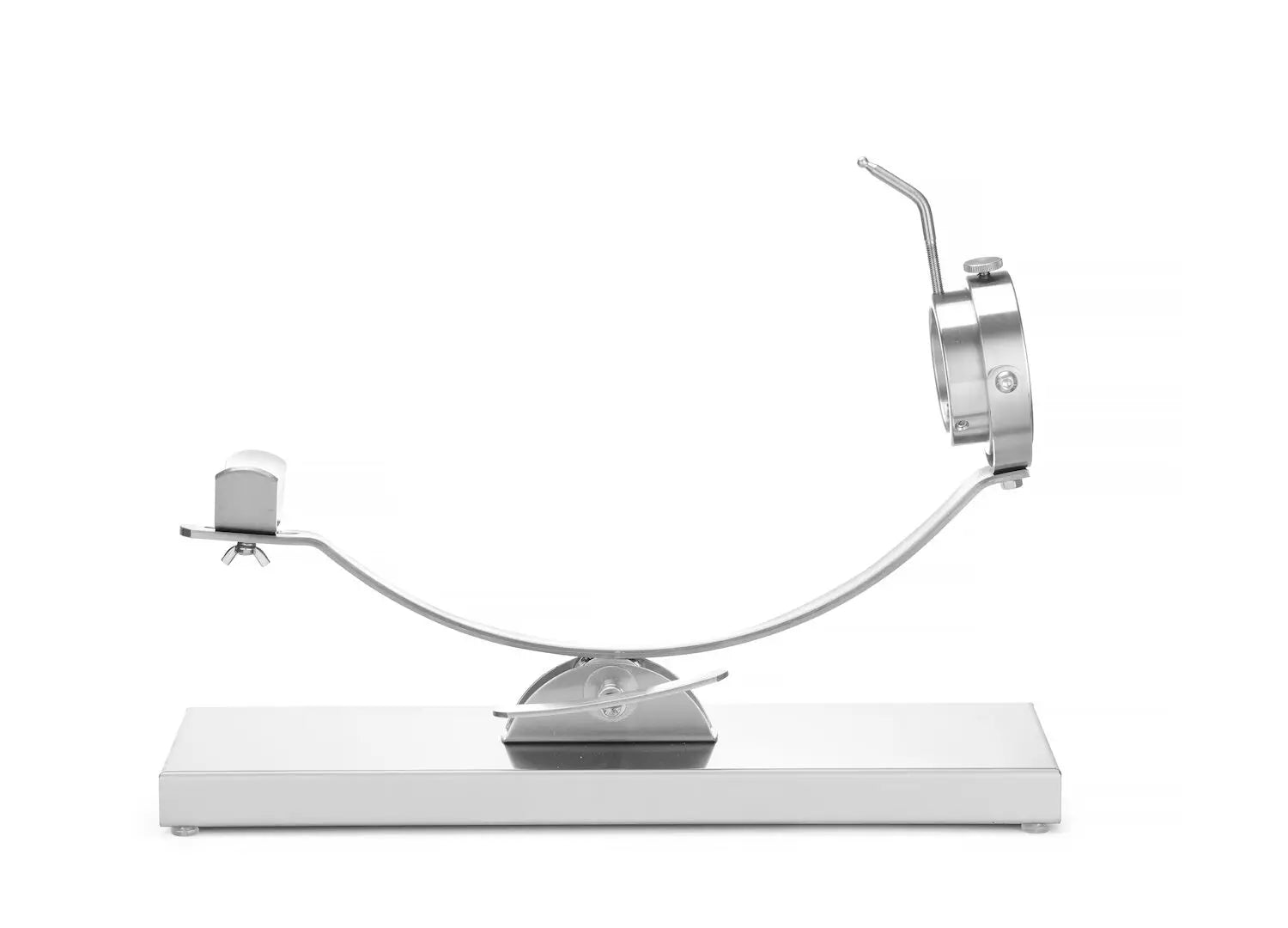 Il prosciutto viene fissato saldamente tramite una vite all'interno di un anello da 80 mm, che consente una rotazione fluida per accedere facilmente a ogni parte del pezzo. Il supporto è dotato di un sistema inclinabile, per una posizione di taglio più ergonomica e precisa.