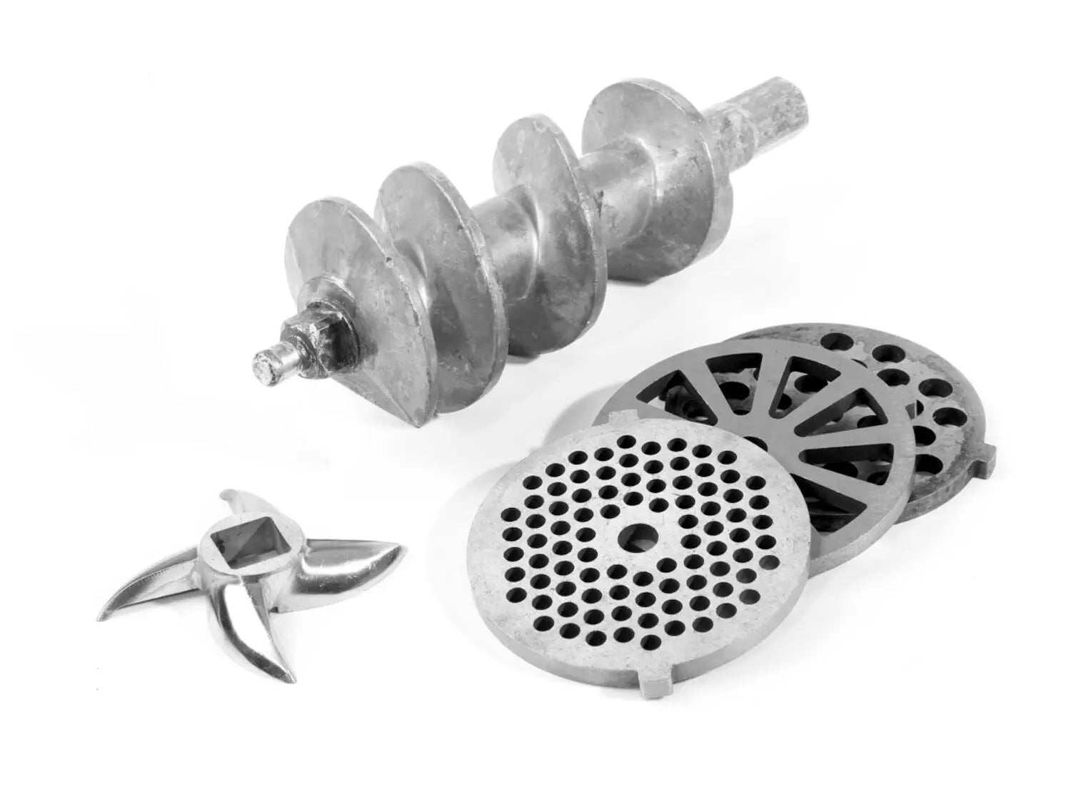 Coclea in alluminio, coltello in acciaio, pestello in plastica. Include 2 dischi da taglio (4 e 7 mm), 3 imbuti per insaccati (Ø 12, 15, 20 mm) e accessorio per tartare. Interruttore acceso/spento/reverse.